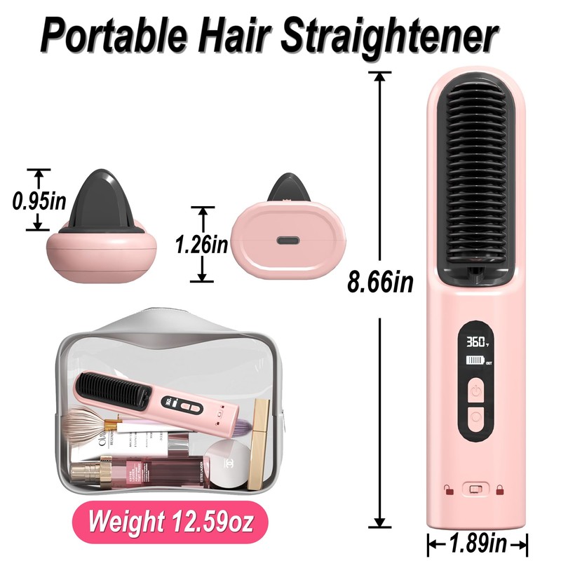 - 💈Wireless and Portable: The dimensions of cordless hair straightener brush is 8.66*1.89*1.97inches, cordless design and compact size suitable for traveling or taking on trips. Included in the box are 7 items there is 1 travel hair straightener,1 heat resistant glove, 1 portable comb, 1 cleaning brush, 1 USB cable, 2 hair clips and 1 storage bag.