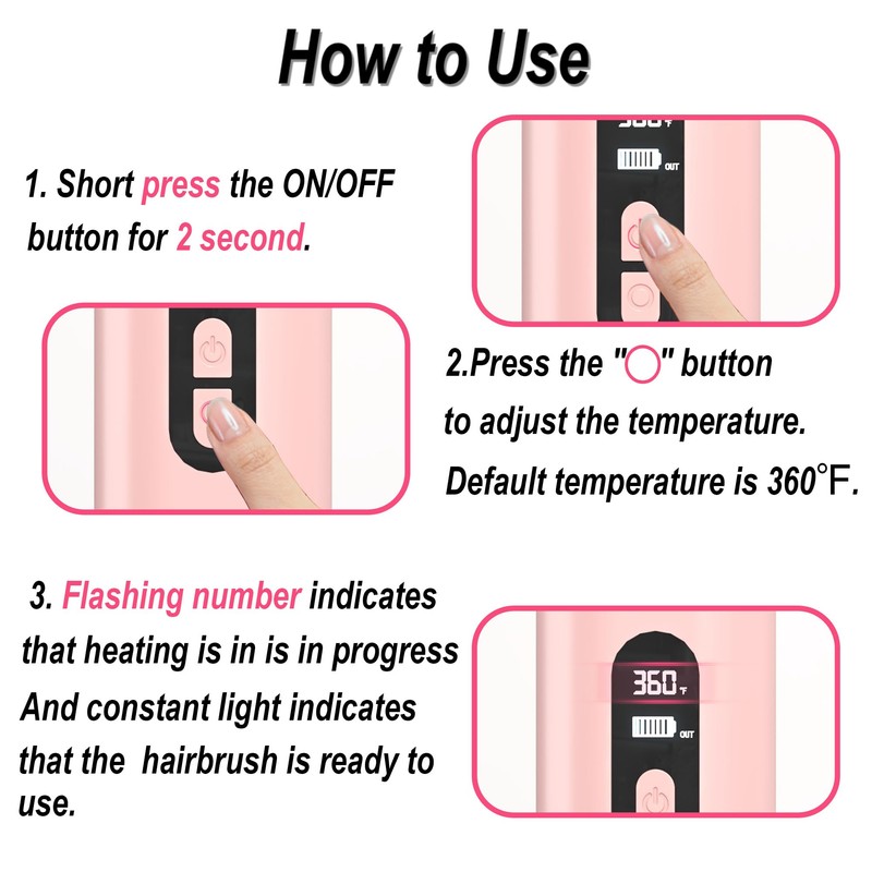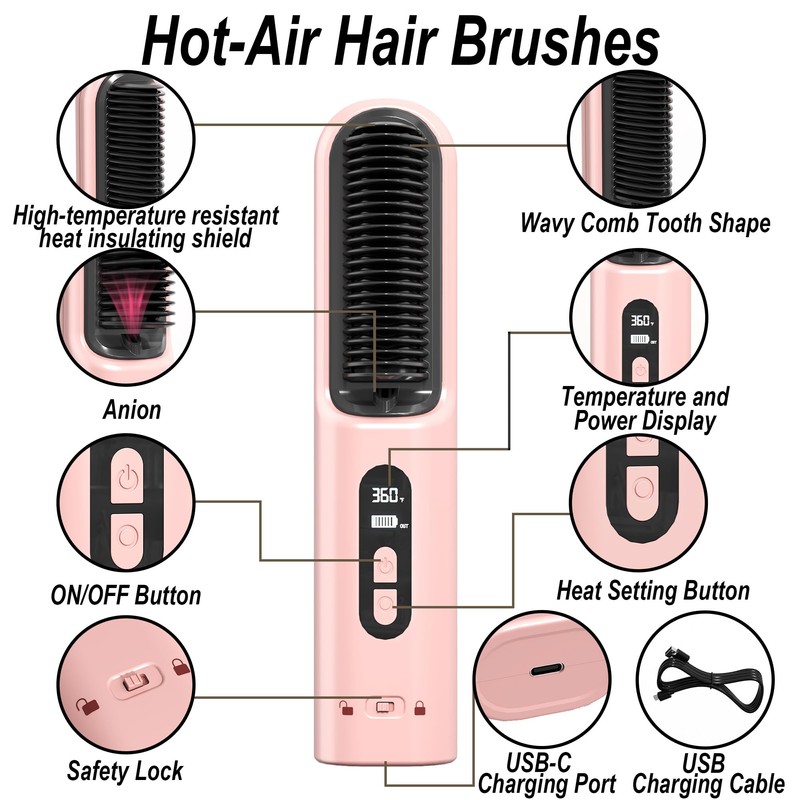 - 💈6 Temperature with LCD Display: The straightener hair brush offers 6 temperature options meet the diverse needs from fine to thick hair, so everyone can find the most suitable temperature setting(300℉-400℉). The front LCD display clearly shows the current temperature and battery level as well as the charging status.