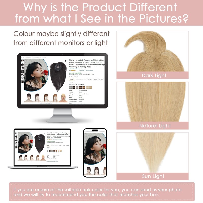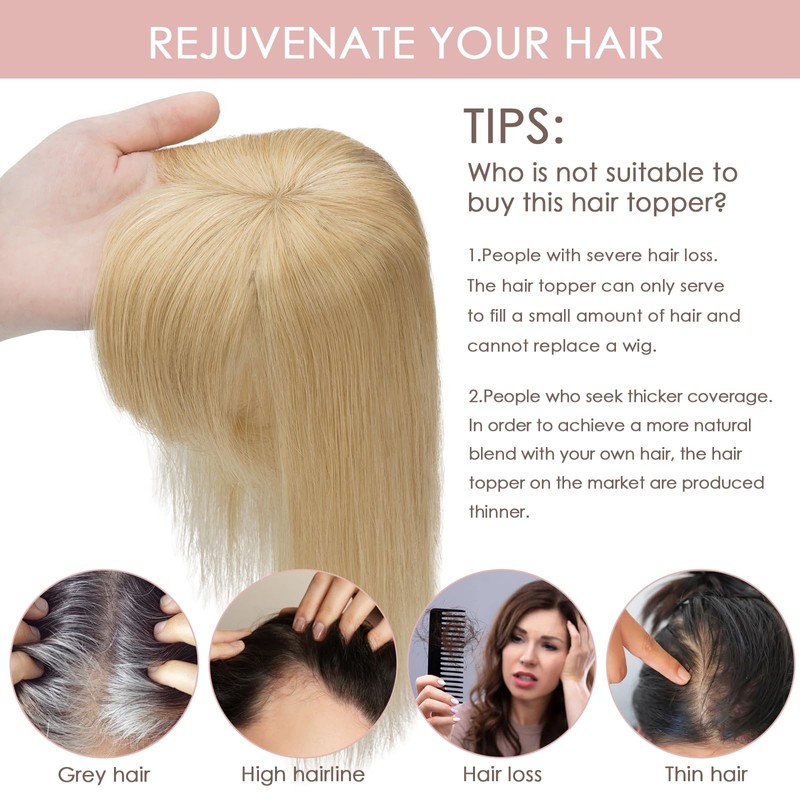 - Our hair topper is mono base, lightweight, breathable and comfortable to wear, no chemical, does no harm to your own hair.