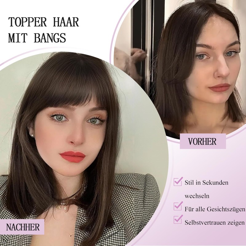 - High quality human hair: This hair topper is made of real human hair, which is soft, natural and shiny. It can be curled or pulled straight depending on the hairstyle. Hair topper with fringe blends perfectly with your own hair