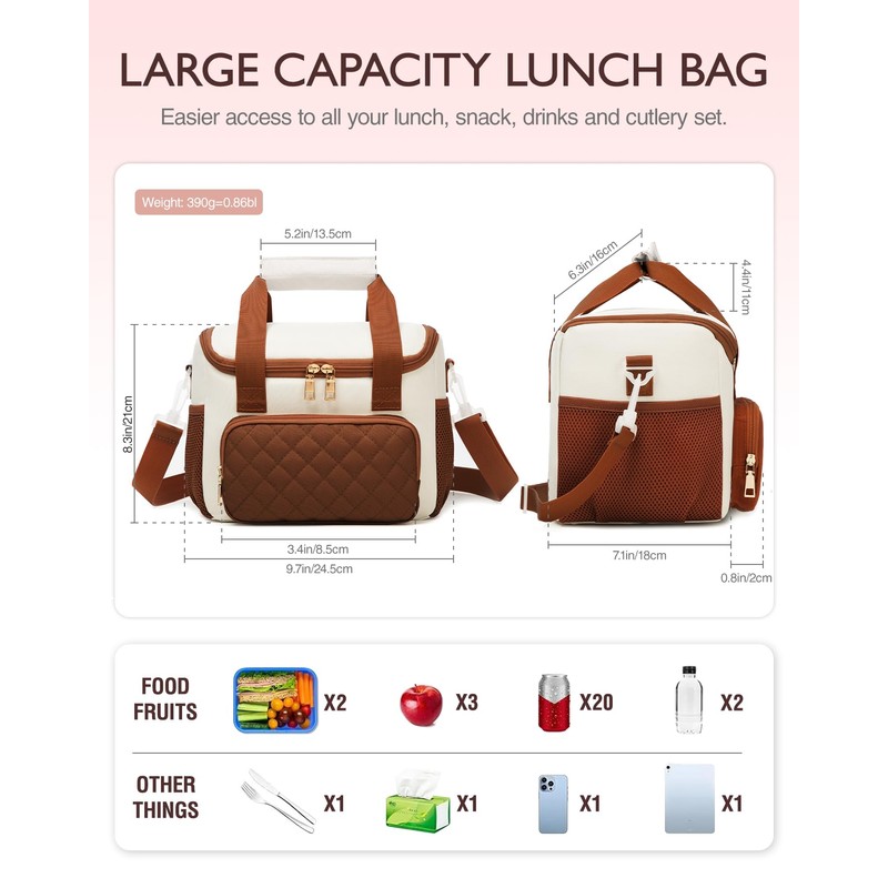- 【Large Women Lunch Box for 2 Meals】Roomy dimensions (9.7"L x 7.9"W x 8.3"H, 0.86bl) for 2 meals of eats - breakfast, lunch, snacks, and drinks. The women lunch bag maximum capacity is 9 L—ample space for up to 12 cans (330 ml), or can hold 2 meals such sandwiches, salad, snacks, drinks, fruits, and more. Good for the office, work, picnics, beach days, trips—it's a perfect companion for your busy lifestyle.