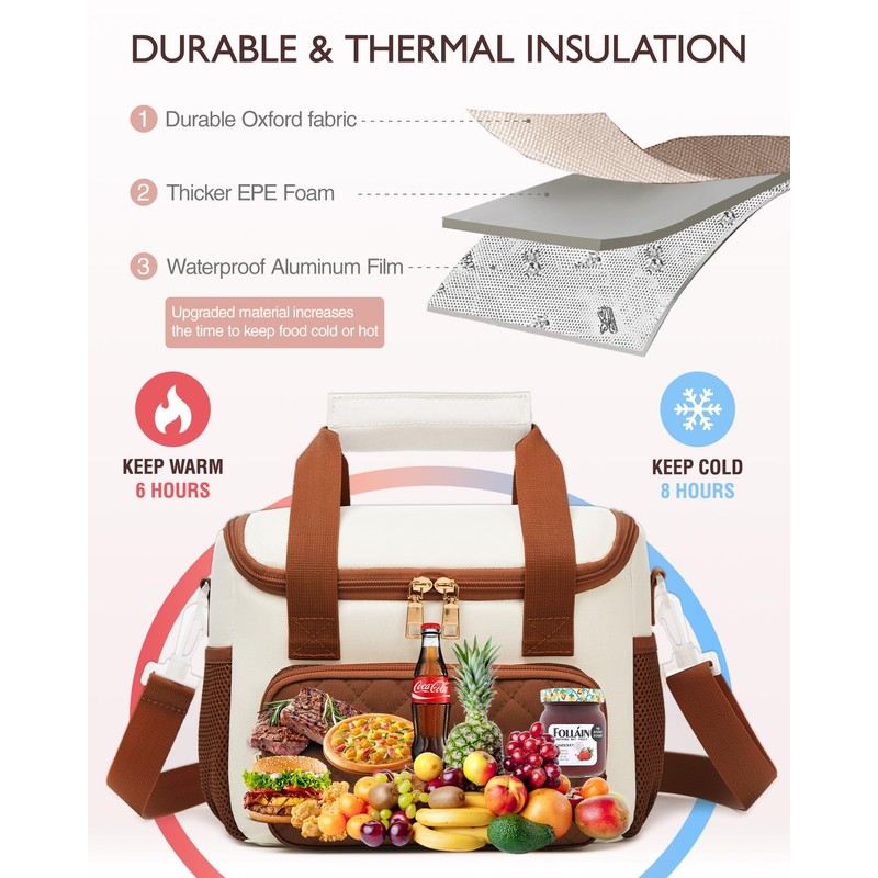 - 【3 Layers of Insulation & Cooler】The women lunch box is made of insulated material to keep your lunch or other food cool or warm for more than 6-8 hours. The interior lining is made of food grade aluminum film (better than PEVA foil, and keeps cold or heat longer), so you can put your food into the bag directly without any worry. The built-in 5mm EPE foam provides great protection to your containers, food, snacks, and drinks.