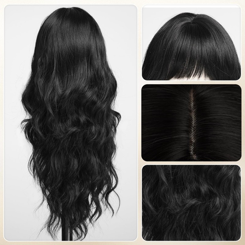 HAIRCUBE Long Wave Wig with Fringe for Women Natural Heat Resistant Synthetic Fibre Wigs with Fringe Daily Cosplay (Black)