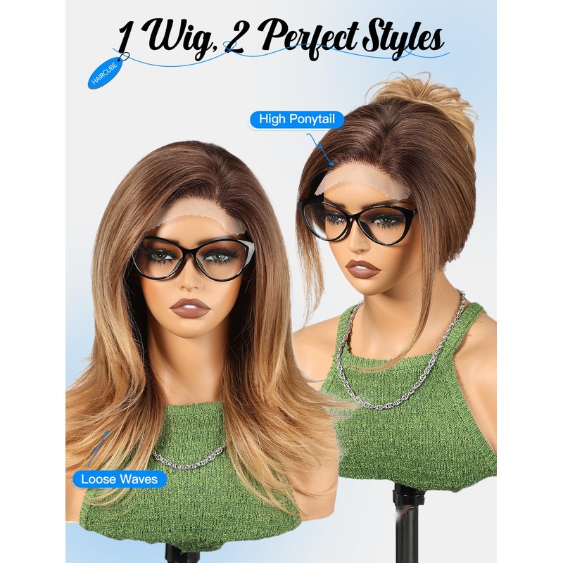 HAIRCUBE Long Wavy Wigs for Women with Partial Bangs, Heat Resistant Fibre Synthetic Lace Front Wig Golden Brown Color