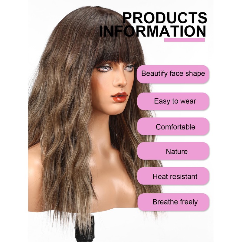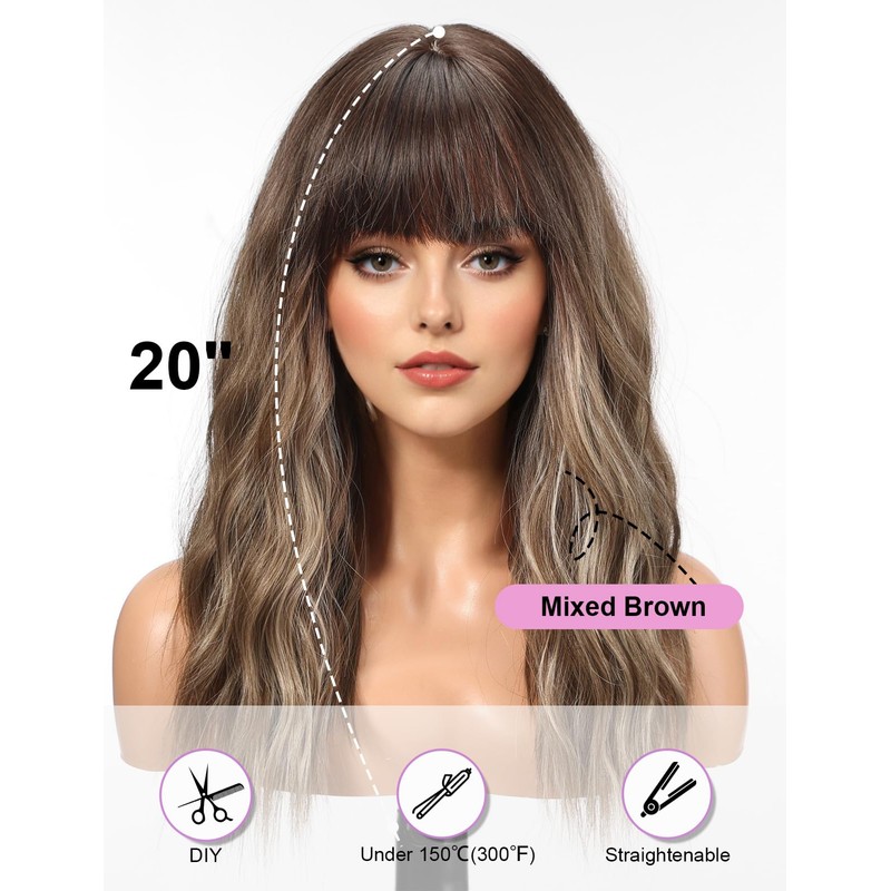 HAIRCUBE Long Wig with Bangs Synthetic Wavy Wigs for Women Mixed Brown Color