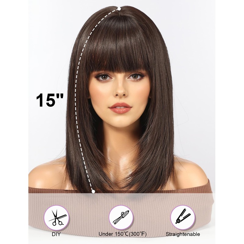 HAIRCUBE Staright Wig with Bangs Synthetic Mid-length Layered Wigs for Women Dark Brown Color