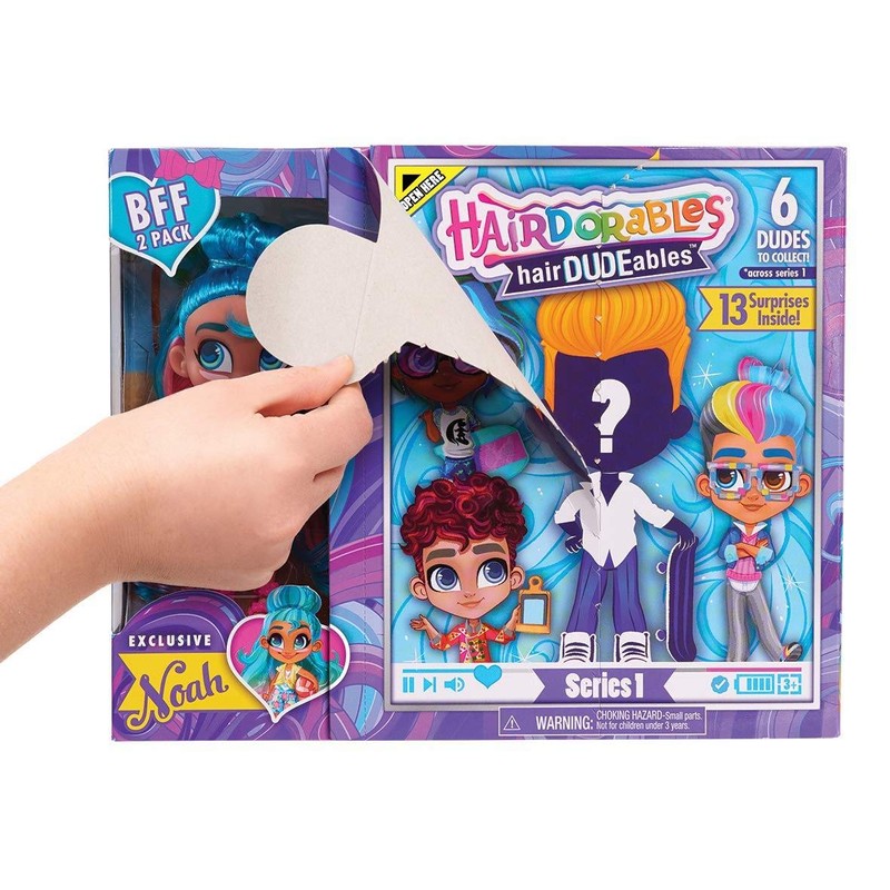 - Introducing an all NEW #DUDESQUAD, the HairDUDEables! The boy #BFFS with the “Big Hair Don’t Care” attitudes! Each package includes a doll duo: one exclusive Hairdorable doll in all new themes, visible through packaging for the very first time and one surprise HairDUDEable. With 6 Dudes to collect, you can choose your favorite #Hairdorable and pull, peel, and reveal a surprise HairDUDEable! With 15 surprises inside, each HairDUDEable comes with new and hip personalities and accessories! Each HairDUDEables comes with their #Hairdorable BFF. Ages 3+