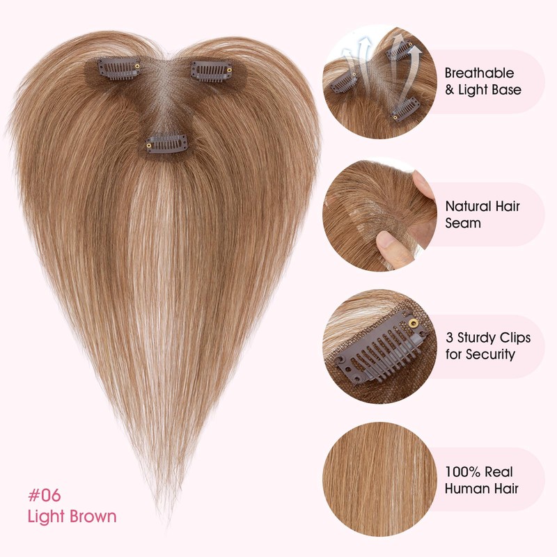 Hairro Human Hair Toppers with Side Bangs, 3D 360° Seamless Real Hair Toppers, Hand-Tied with 3.5"x4.7" T-shaped Base, Clip-In Hairpieces to Add Volume on Top, 11 Inch Light Brown