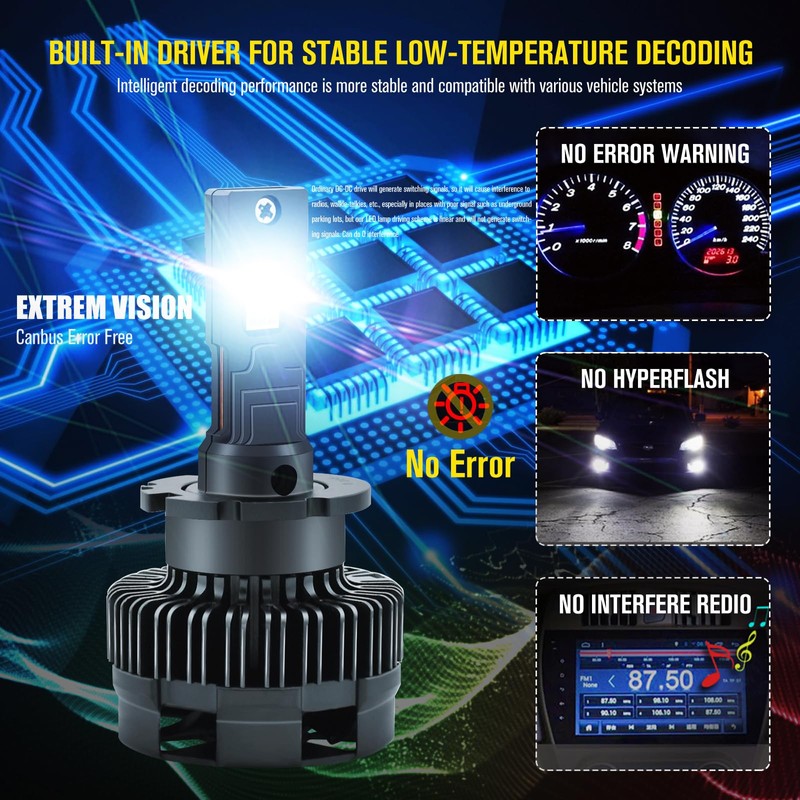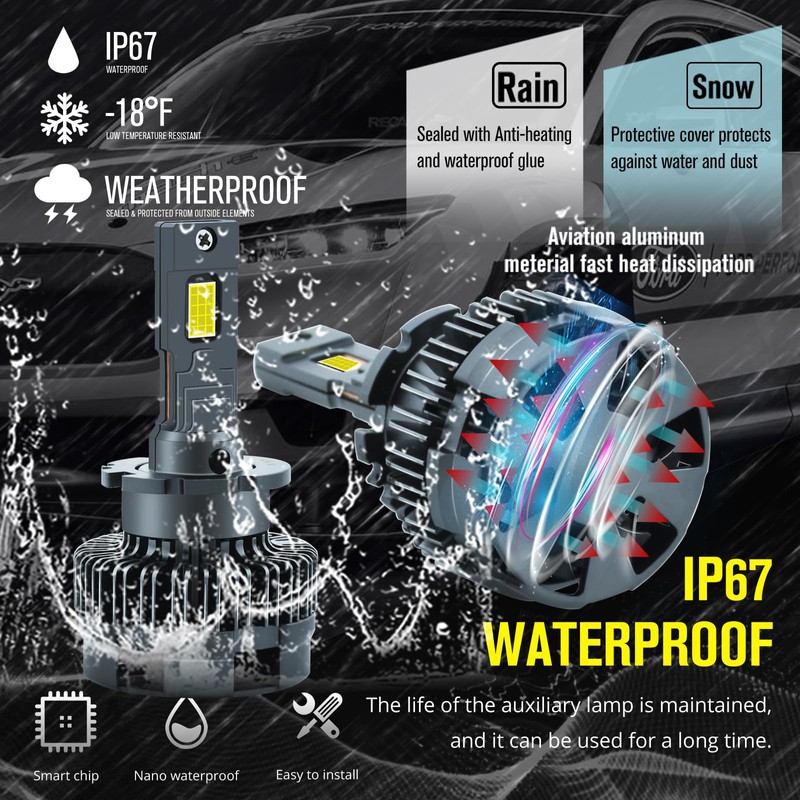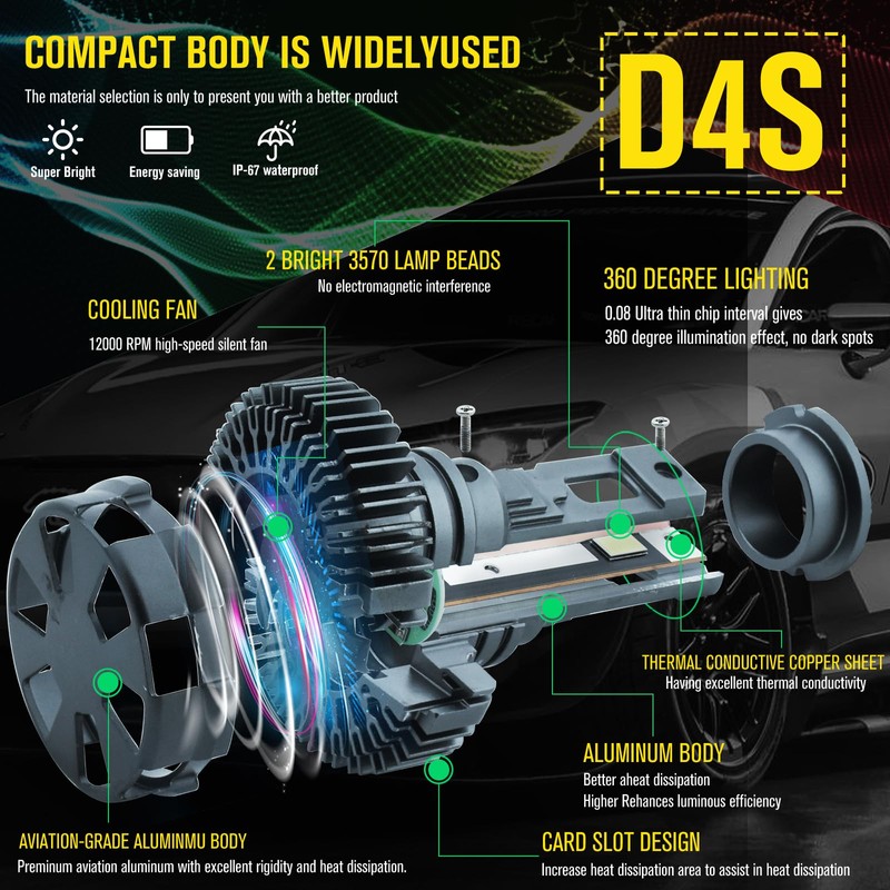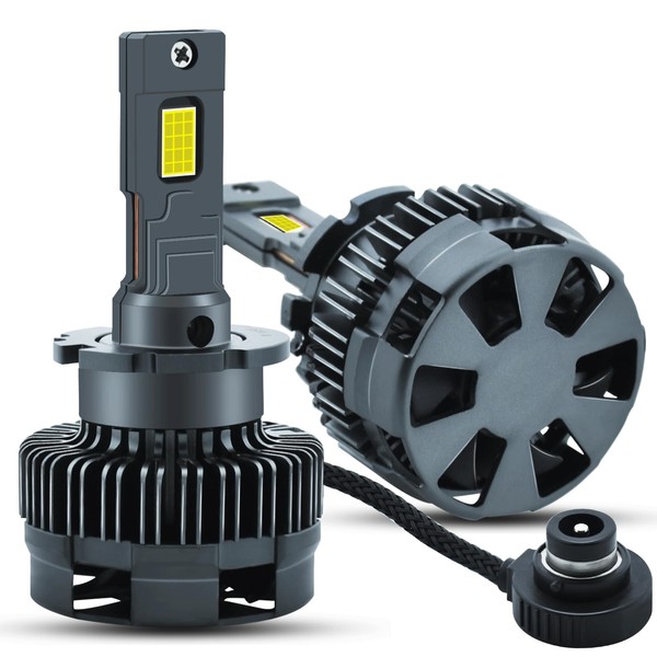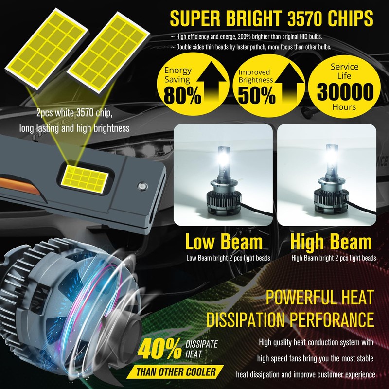 • 👍300% Brightness:D3S LED headlight bulb used 2pcs high power 55mil 3570 LED chips/bulb, dual copper tube thermal conductivity material, and a powerful turbo cooling fan, it's 300% brighter than standard HID bulbs.