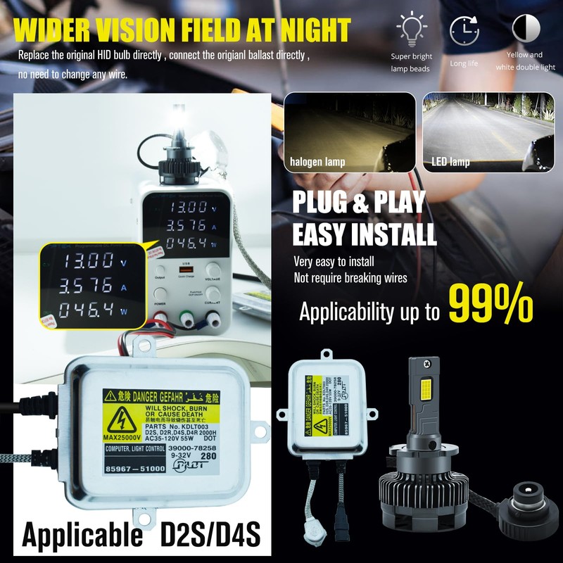 • 👍Intelligent Matching Power Output:Built in IC circuit driver, automatically matched with HID ballast power output, power up to 80W/bulb.TIPS:When installing, please turn off the car before installing,avoid the power of ballast touching your hands. Thank you!