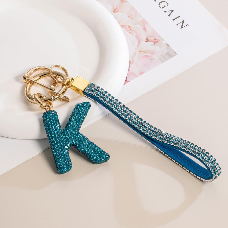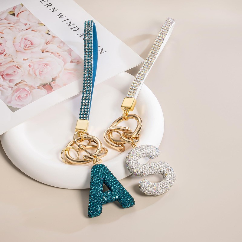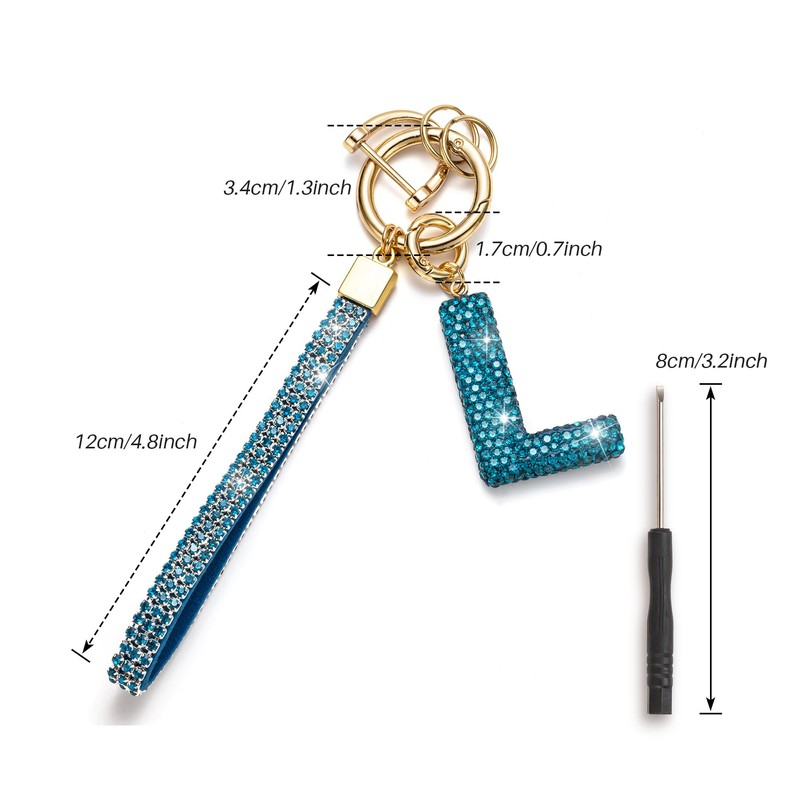 • This keychain come with a bling letter charm, 2 rings for keys, a D-ring and a little flatbed screwdriver for the D-ring.
