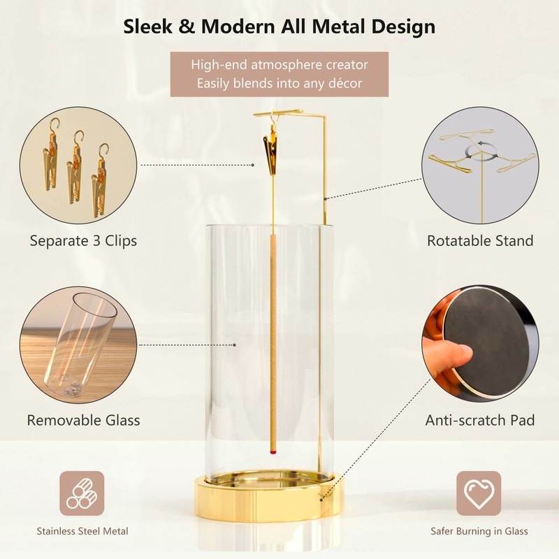 HaisWonsa Incense Holder Ash Catcher - Upside Down Glass Incense Holder for Sticks, Reverse Inverted Anti Ash No Mess Insence-Stick Holder, Modern Metal Vertical Incense Burner for House Decor, Gold