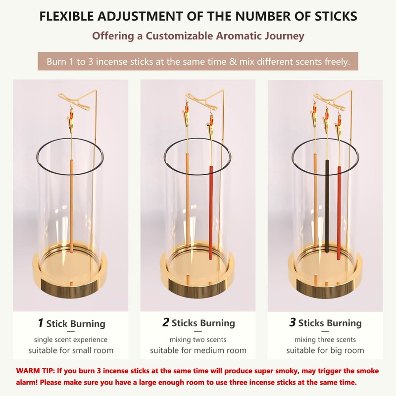 - ⚠️ 𝐖𝐀𝐑𝐌 𝐓𝐈𝐏𝐒 ⚠️: 1. If you burn three incense sticks at the same time will produce super smoky, may trigger the smoke alarm! Please make sure you have a large enough room to use three incense sticks at the same time. 2. No incense sticks come in the package.