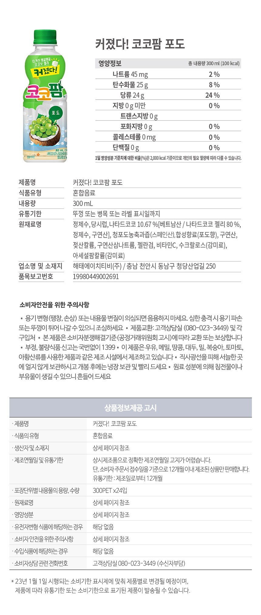 해태 코코팜 탱글 알맹이 포도 300mlx24개