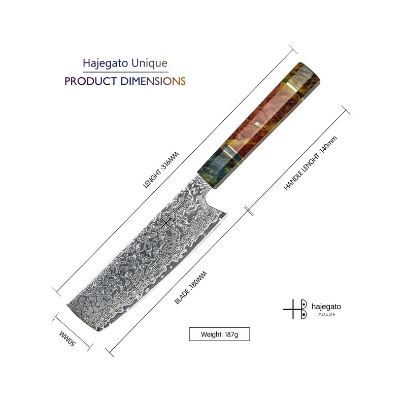 Hajegato is a family-owned culinary brand synonymous with QUALITY, RELIABILITY, & UNIQUENESS Stand Out from the Crowd. EXPERIENCE THE DIFFERENCE with Hajegato Blades - a cut above Perfection. Whether you're an amateur or professional chef, our specialist knives are sure to enhance your precision cuts with our ultra-sharp blades. Hajegato knives are designed by a professional chef with no compromises on attention to detail. What's even more exciting is because they are handmade, no two knives will ever be the same hence eliminating chances of mix-ups in a professional kitchen. Lifetime Warranty on Manufacturer's Defect Hardness: Hajegato chef knife features an ultra-sharp Damascus steel cutting core at 62+Rockwell hardness: supreme performance and perfect grain. Premium high-carbon Damascus steel layers ensure exceptional strength, durability and perfectly balance G10 HANDLE DESIGN: For minimal fatigue, finger numbness or aches after holding it for a long time, the Hajegato Chef Knives handle is made from G10 wood. It's known for its comfort and durability used where the strength to size ratio is critical. Material: Hajegato 8 carbon stainless which helps create beautiful patterns on knives and keep sharp for a long time even after cutting tough meat or fish, Vegetables, Fruit and more with Precision Slicing. No tearing, squashing, shredding or bruising the herbs only the best results with Hajegato knives. Hajegato blades are committed to producing highest quality knives. Specifications: Blade: 18 cm Blade Width: 5 cm Handle: 13.6 cm
