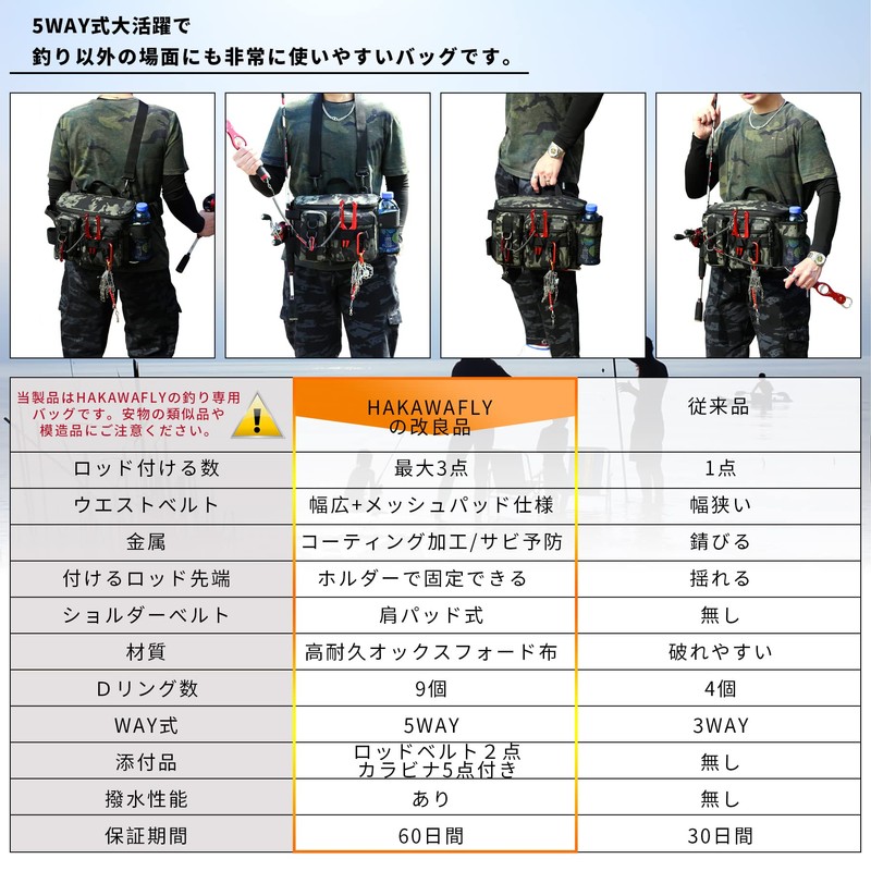 HAKAWAFLY Fishing Bag, Wide Mouth, Large Capacity, Waist Bag, Wide Fishing Bag, 5-Way Tackle Bag, Waterproof, Hip Bag, Multi-functional, Removable, Left and Right Shoulder Bag, Pad Type, Water