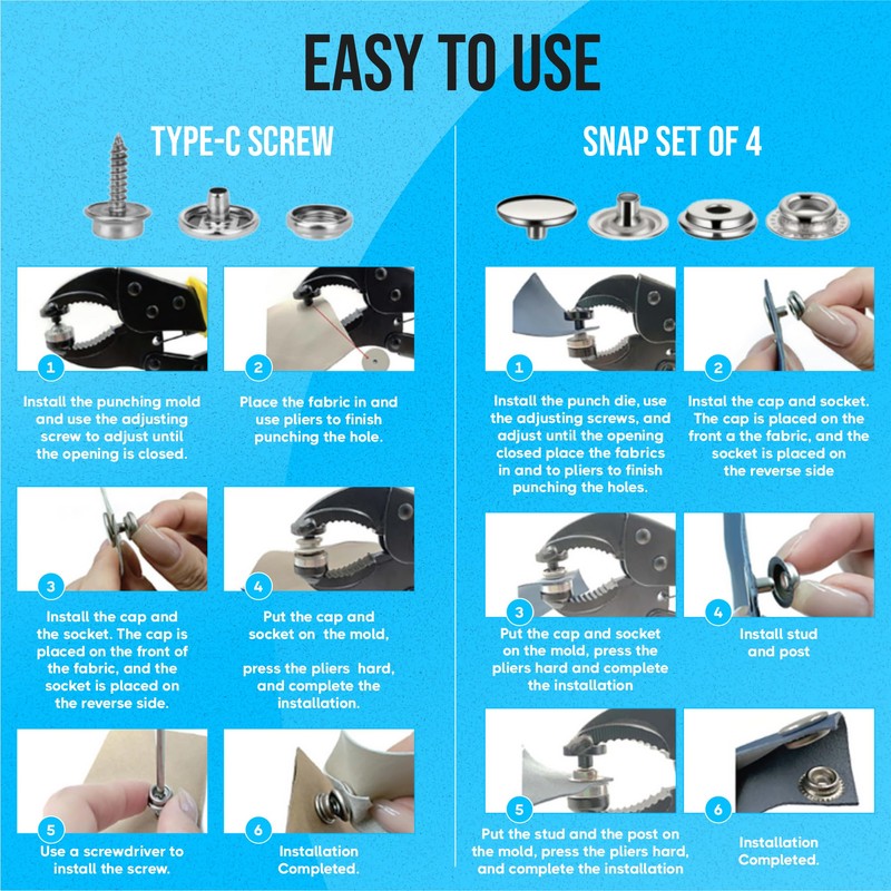 - EASY TO USE: Our Snap Fastener Tool is designed for easy use, making it perfect for both beginners and professionals. Ideal for snap kit projects, snap button installations, and snap repair kit needs, it ensures smooth and efficient application every time. With our clear and simple user manual, you can quickly understand how to use this snap tool kit, making snap installation a breeze.
