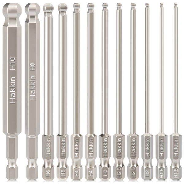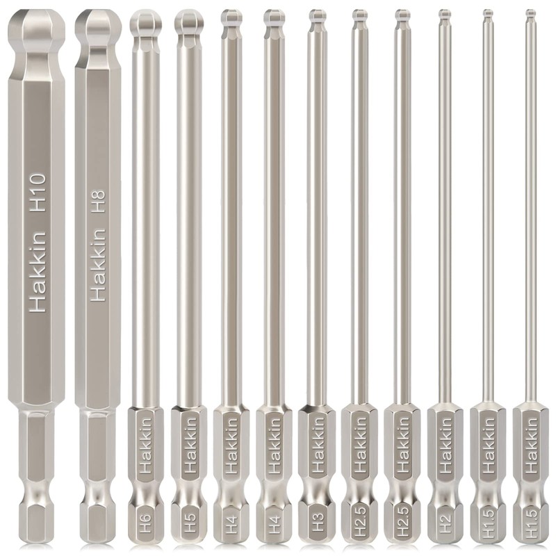 - 🔥【𝗣𝗿𝗲𝗺𝗶𝘂𝗺 𝗠𝗮𝘁𝗲𝗿𝗶𝗮𝗹】Hakkin Ball End Hex Bits are made of high quality S2 Steel, high hardness, wear resistance. The surface adopts electroplating process, durable for long time service. Heat treated for durability, hardness reaches 65RCH.