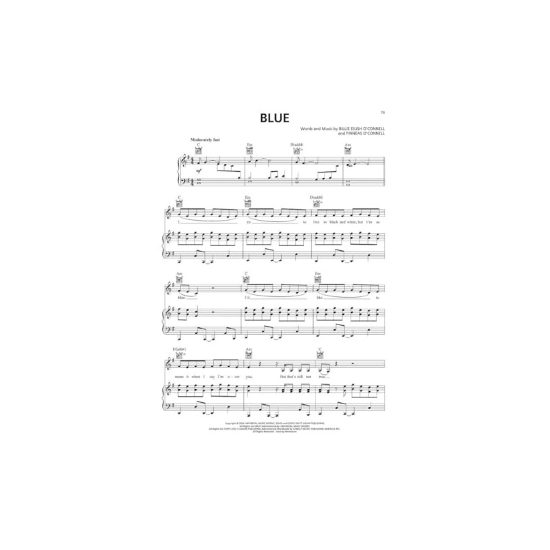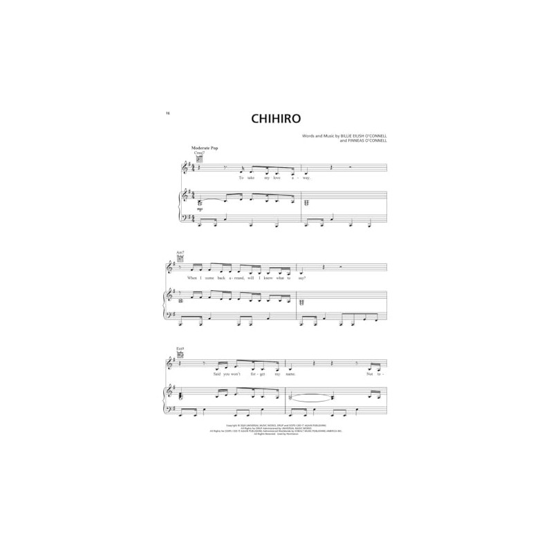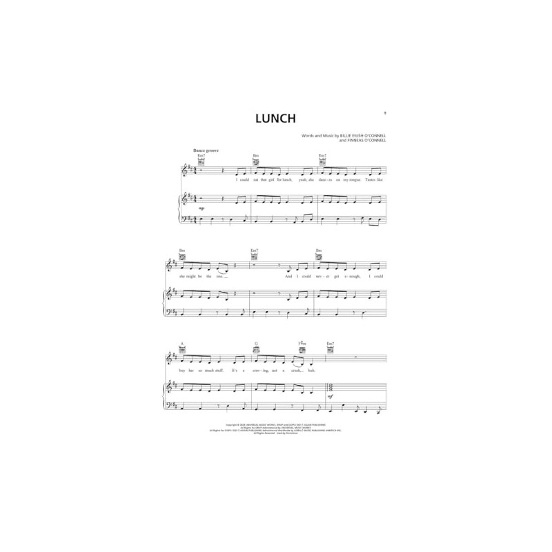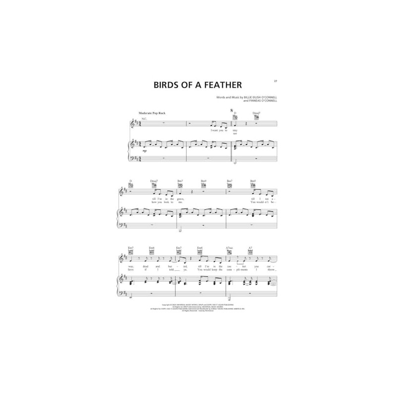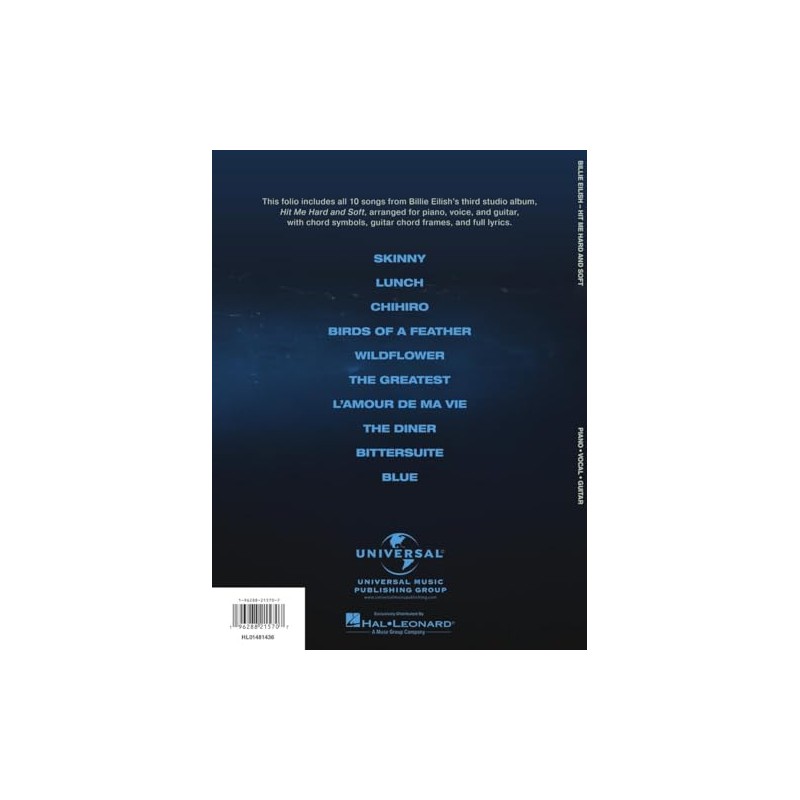 (Piano/Vocal/Guitar Artist Songbook). Billie Eilish has done it again! The highly-anticipated third album from the nine-time GRAMMY winner features a sound that redefines and explores genre boundaries, trends and soundscapes, immersing listeners into a full spectrum of emotions. From the mature "Lunch" to "Birds of a Feather" and "Chihiro," there's plenty of hits to keep this record in the rotation for many years to come! Our matching folio features all 10 tracks arranged for piano and voice with guitar chord frames, including: Birds of a Feather * Bittersuite * Blue * Chihiro * The Diner * The Greatest * L'Amour de ma Vie * Lunch * Skinny * Wildflower.