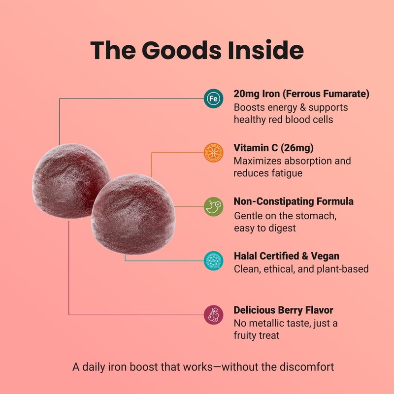 Each gummy comes with Vitamin C to help your body soak up every bit of the 20mg of iron. Translation? More energy, better focus, and no more feeling like a deflated balloon by noon.
