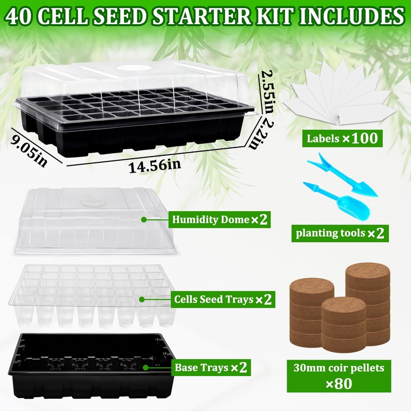 - All in One Starter Kit: This plant starter kit contains 2 basic trays, 2 seed trays with 40 cells, 2 humidity covers, 2 planting gadgets, 80 coco pellets, and 100 labels. This kit has everything you need and will work like a greenhouse. Help your fruits, vegetables, and flowers grow better.