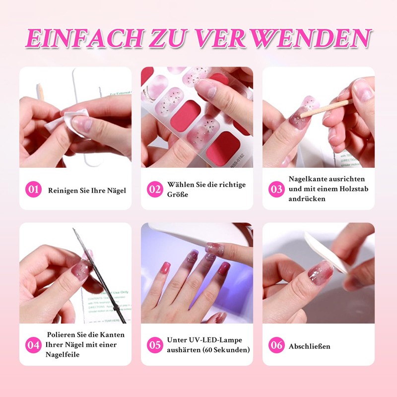 - 💅【Halbgehärtet & langlebig】Nagelsticker selbstklebend im neuen Stil werden durch Aushärten von echtem Gel-Nagellack mithilfe der halbhärtenden Technologie hergestellt, mit Elastizität und Glanz. Mit Hilfe dieser Gel Sticker kannst du den angesagten Look in nur 20 Minuten auf deine Nägel zaubern. Nach der vollständigen Aushärtung unter UV-/LED-Licht (die nur 60 Sekunden dauert) können nagel aufkleber bis zu zwei Wochen halten.