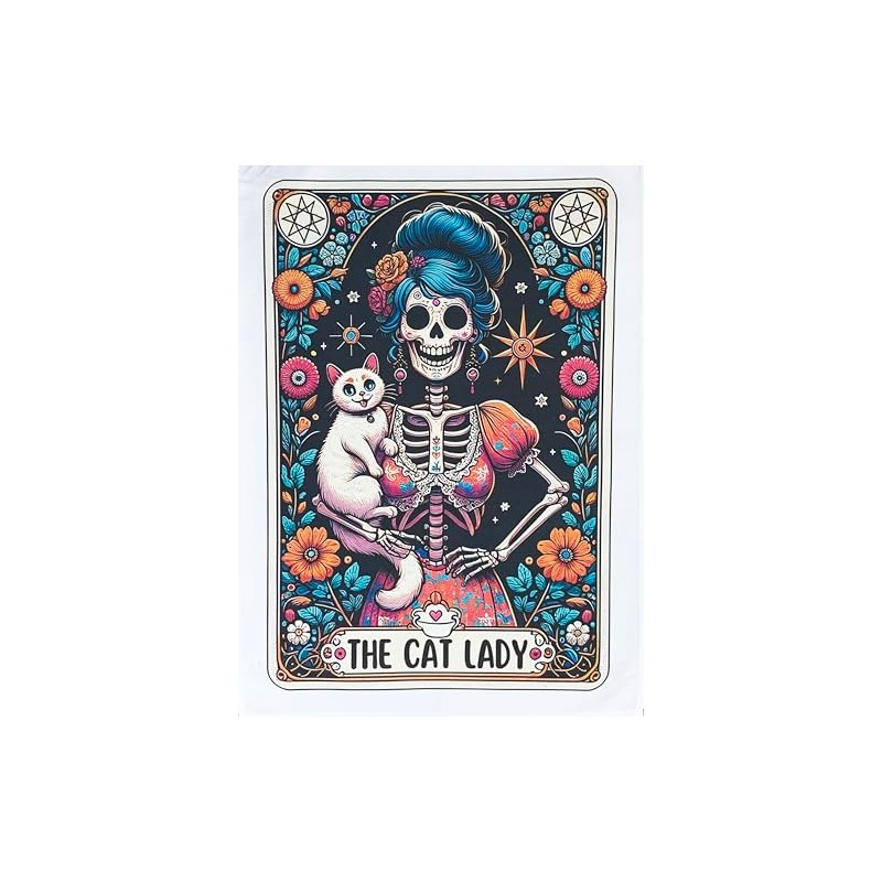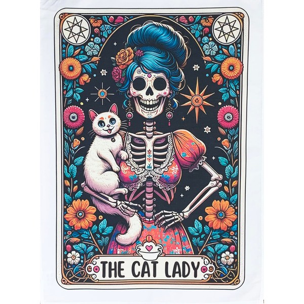 The Cat Lady Tarot Card Large Cotton Tea Towel. Not your typical Cat Lady. This one is a glamourous skeleton holding a cat. In more recent decades, the concept of a cat lady has been associated with "romance-challenged (often career-oriented) women". A cat lady may also be an animal hoarder who keeps large numbers of cats without having the ability to properly house or care for them. Made from 100% cotton, hemmed on four sides. Cotton is high quality 185gsm. The dimensions of the Tea Towel are: 47cm (w) x 65cm (h). From the Series 1 Original Line by Half a Donkey