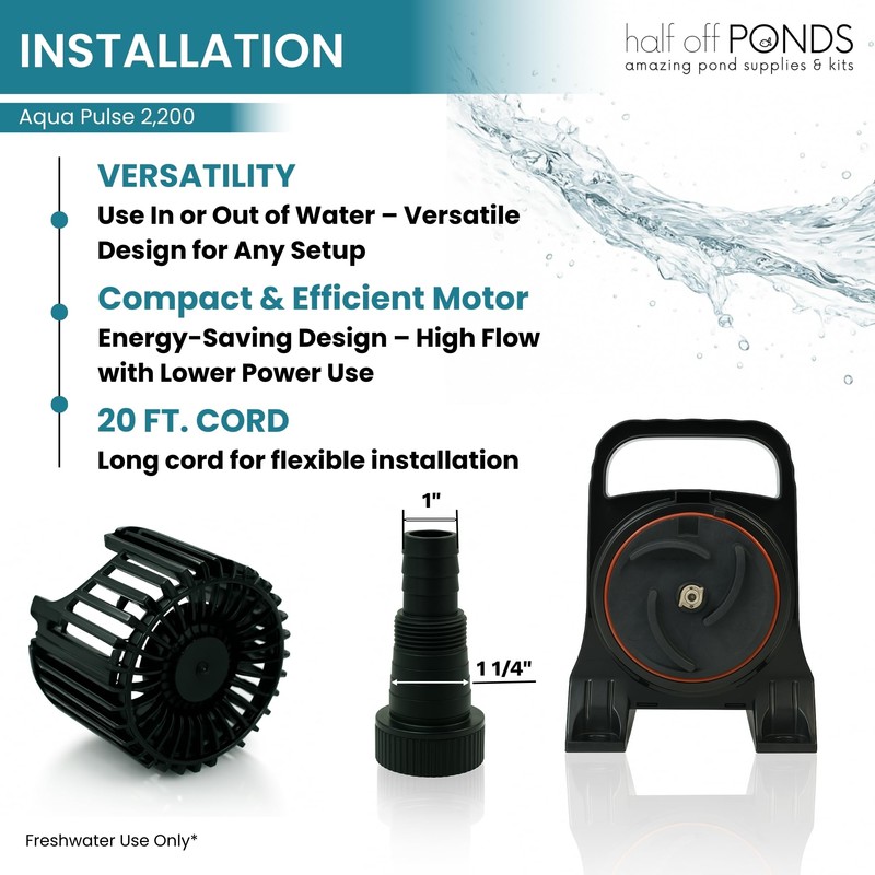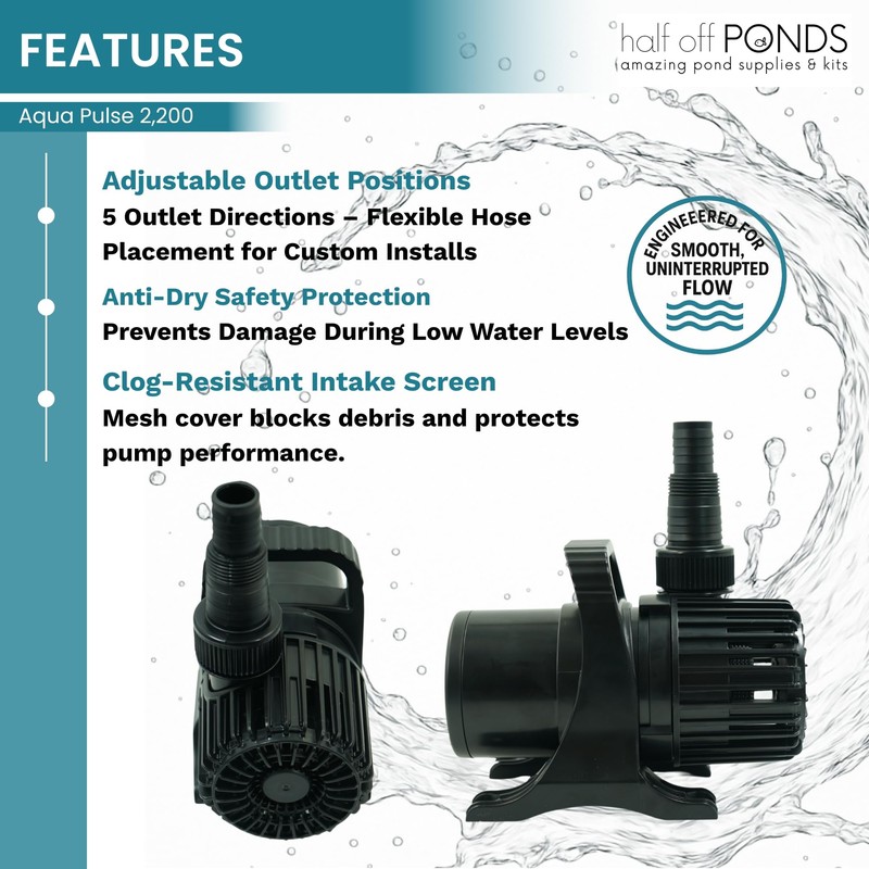 - Powerful and Energy-Efficient: The Aqua Pulse 2,200 submersible water pump offers powerful, energy-efficient performance with a low 120-watt draw, making it an ideal choice for pond pumps for outdoor ponds, ensuring operational cost savings.