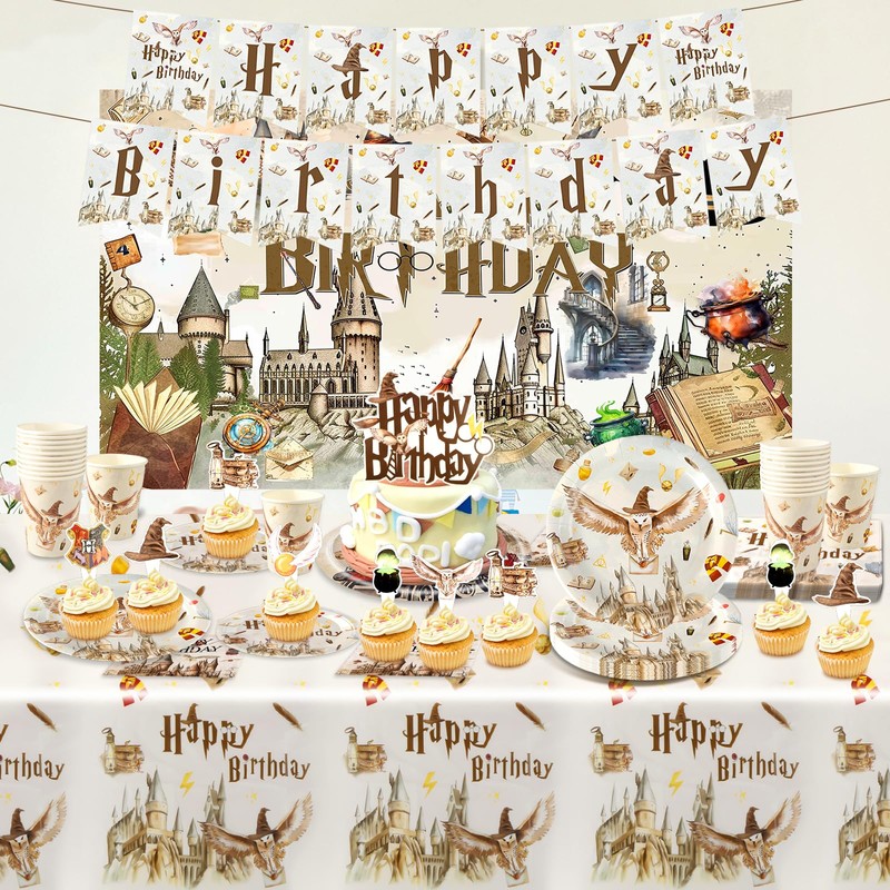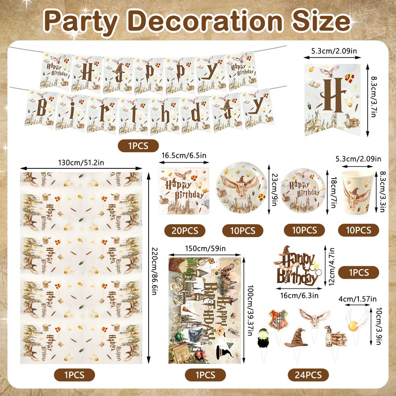• 【Birthday Party Tableware】Magic birthday tableware set includes 10 7-inch plates, 10 9-inch plates, 10 paper cups, 20 napkins, 1 disposable tablecloth and 1 Harry Potter Happy Birthday banner 1 large cake topper, 24 Small Cake Toppers, 1 backdrop, all-around satisfy your birthday party tableware and decorations needs, no need to worry about buying extra tableware.