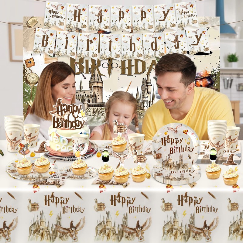 hali Balloons2 78PCS Wizard Supplies Set, Party Tableware Set, Reusable Birthday Party backdrop Happy Birthday Banner and Tablecloth Sets Kids Decorations for 10-20 Guests