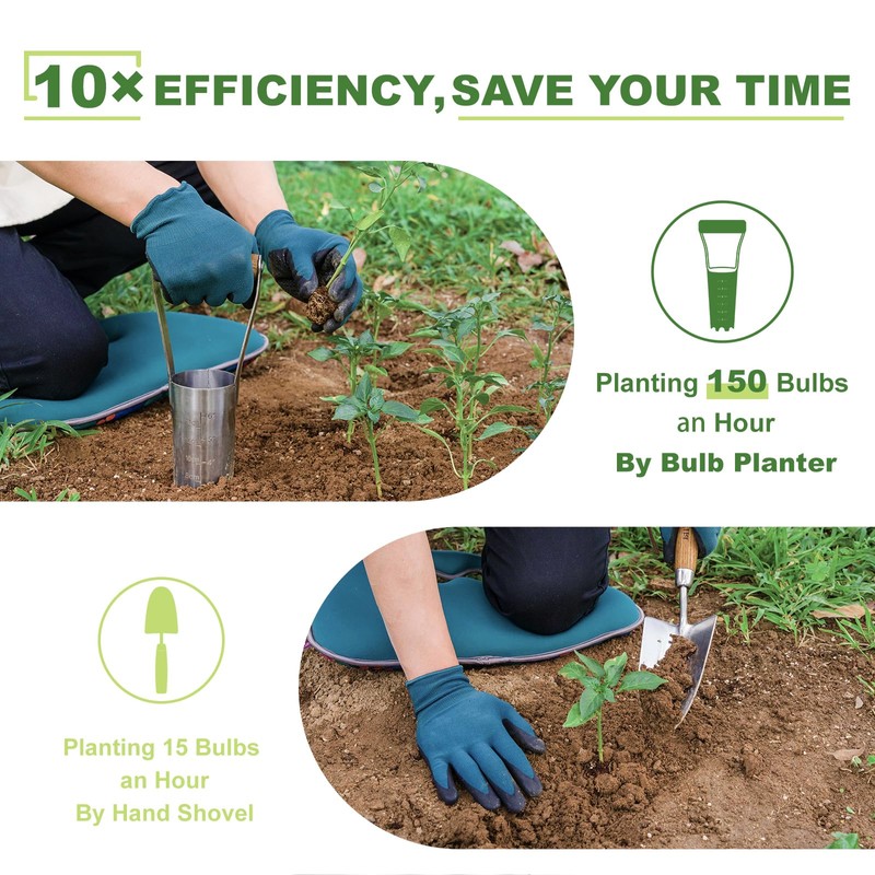 • 【10 × Efficiency Saves Your Time】This bulb planter makes planting go faster than digging with a regular shovel, just push down and twist, and up comes the dirt leaving a perfect hole of whatever depth you desire. Save a lot of digging time and you can easily plant 150 bulbs in an hour more efficiently than using a hand shovel to plant 15 bulbs in an hour.
