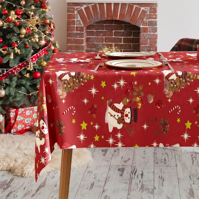 Elevate your holiday celebrations with this Christmas-Themed Tablecloth, perfect for adding a festive touch to your dining area. Featuring vibrant red tones adorned with classic holiday imagery like snowmen, Christmas trees, stars, and candy canes, this tablecloth brings joy and warmth to any occasion.