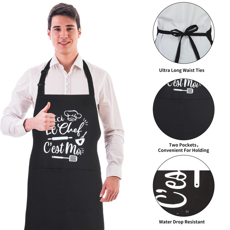 Halinuia Cooking Apron for Men, Ici Le Chef C'est Moi Cooking Aprons Waterproof Adjustable Barbecue Apron with Pockets Idea Father's Day Gift, black