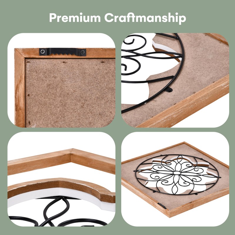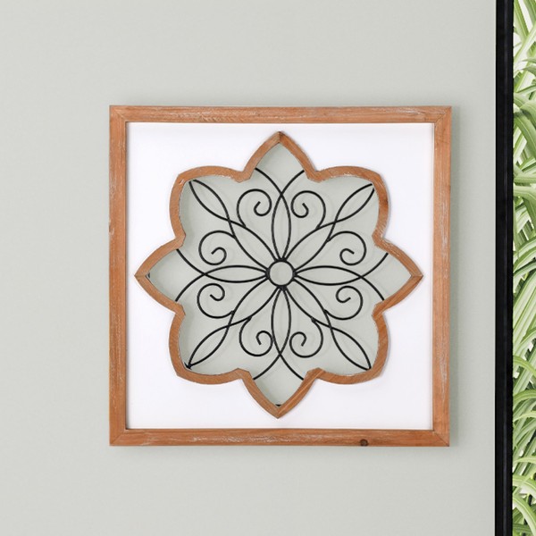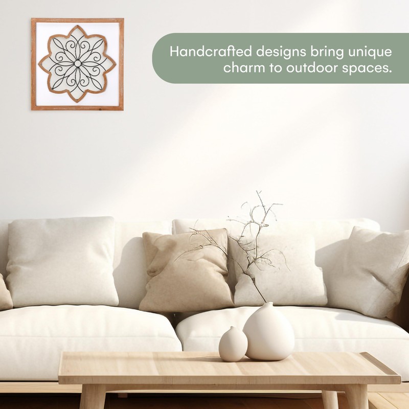 Hallops Carved Wood Wall Decor - Rustic Unique Design Wall Sculptures - Entryway Wood Wall Art - Brown and White - Old World Charm - Intricately Carved Tile - Quatrefoil Design - 16.5 x 16.5 inch