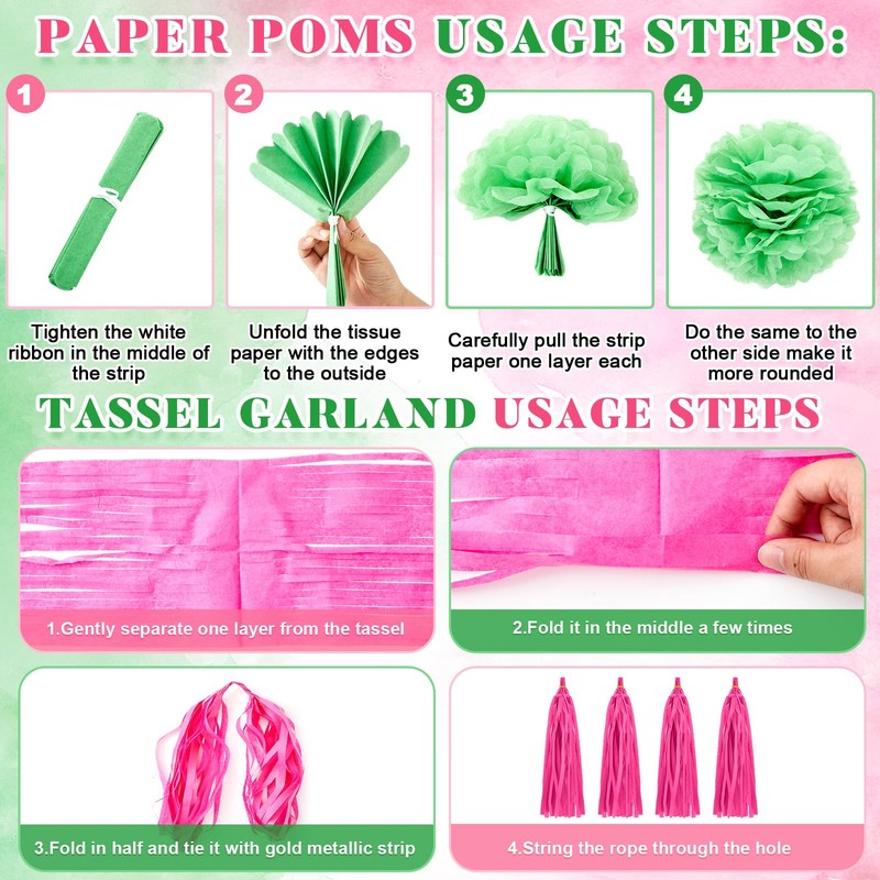- Easy to Assemble: even if you've never decorated before, you can create a stunning setup with ease; Designed for simplicity, the decorations can be effortlessly draped from ceilings, walls, tables, and more; While the paper tassel garland requires a touch of DIY, clear instructions ensure you have a stress-free assembly experience