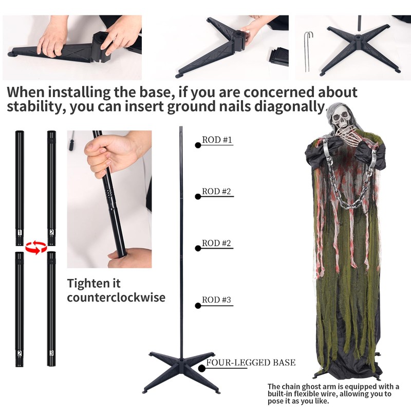 • Easy to Install: The Halloween decoration is very easy to install. Follow the instructions to assemble the pole and base. If placed outdoors, you can use the ground nails included in the package for fixation. Simply install the battery, which requires 3 AA batteries (not included), and place it where you want to decorate. Turn on switch, and you will find that its eyes light up and emit a terrifying sound. It will also sway with the rhythm of the music, adding a spooky atmosphere to the night.