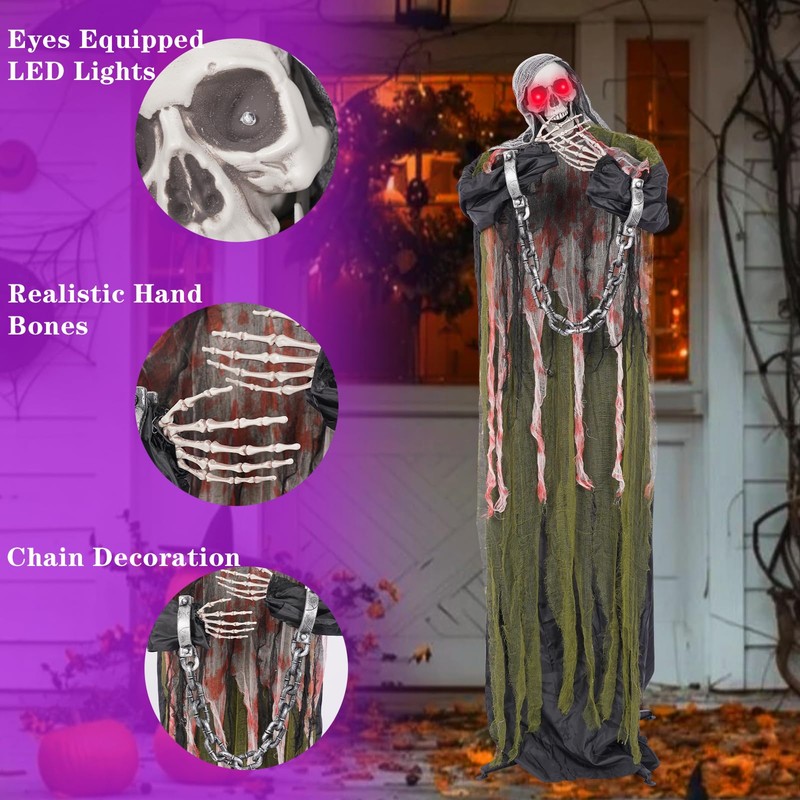 Halloween Decorations 6Ft with Glowing LED Eyes Evil Grim Reaper with Chain, ...