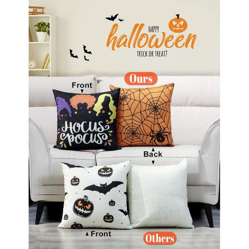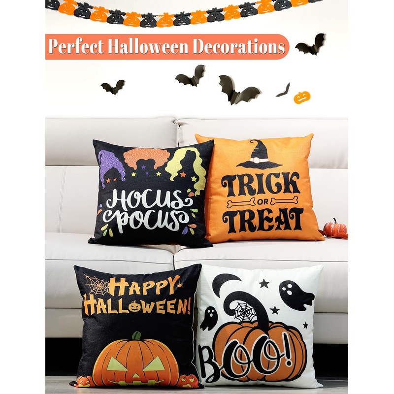 - Double-Side Print: TOYPOPOR set of 4 Halloween pillow covers are double-side print, covered the different cute pattern on each side, we designed 8 cute halloween patterns like pumpkins, Black cat,hocus pocus, spider webs, Trick or Treat, BOO, Black castle, bats & skulls. They are well made and bright colors, perfect addition to the Halloween decor. We can place these pillowcase on sofa, chair, couch, bed, porch, patio, car, office, etc, providing a good holiday atmosphere for Halloween.