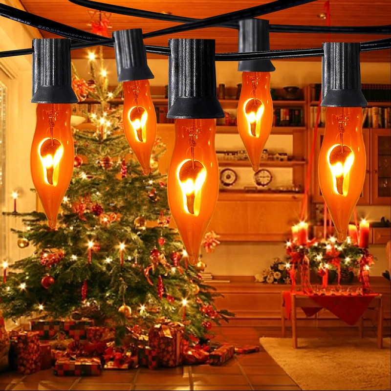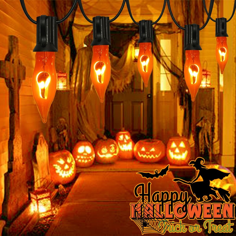 - Halloween Flame Bulbs Outdoor: The uniquely designed flame-shaped C7 Halloween lights bulbs shine in a soft orange glow. orange light bulbs create a realistic flickering flame effect, ideal for indoor outdoor string lights, candle lamp and festive lighting.