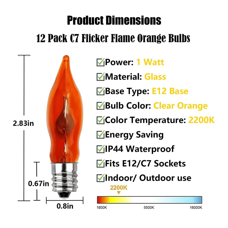C7 flicker flame orange light bulb with E12/C7 base is suitable for all outdoor Halloween light strings, wall light, chandeliers and electric candles.