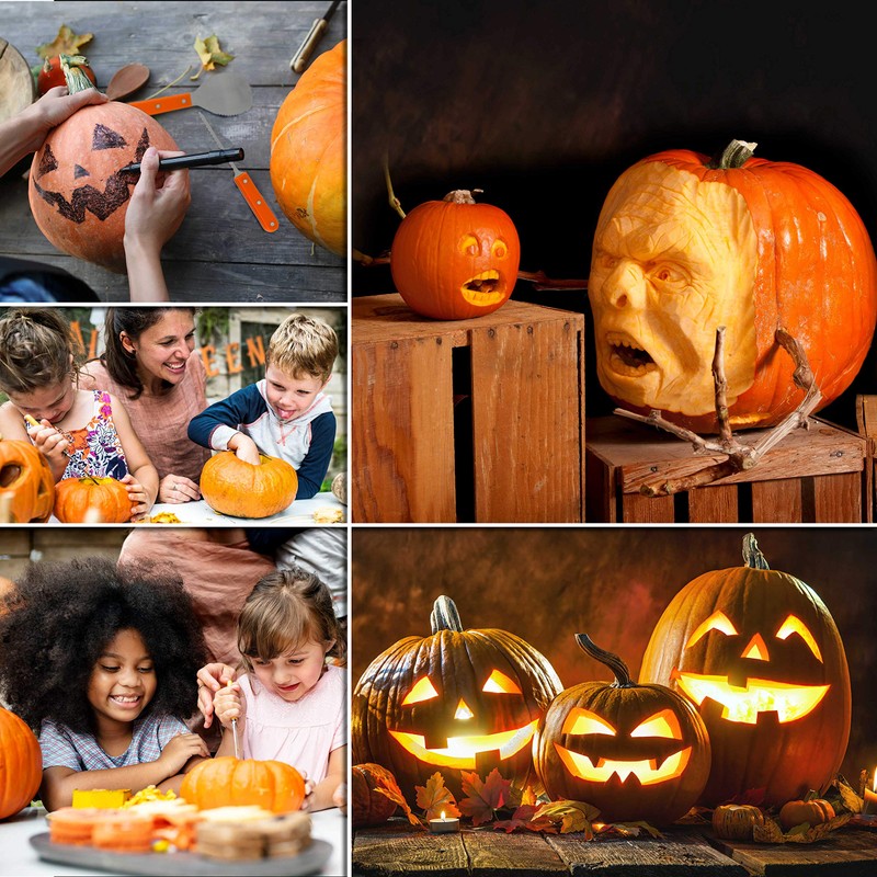 Un kit de herramientas de talla de calabaza profesional de acero inoxidable de alta calidad de 14 piezas con cada herramienta que cualquier nivel de tallador necesitaría para tallar fácilmente detalles increíbles realistas en tus propias calabazas de Halloween Jack-o-Lantern