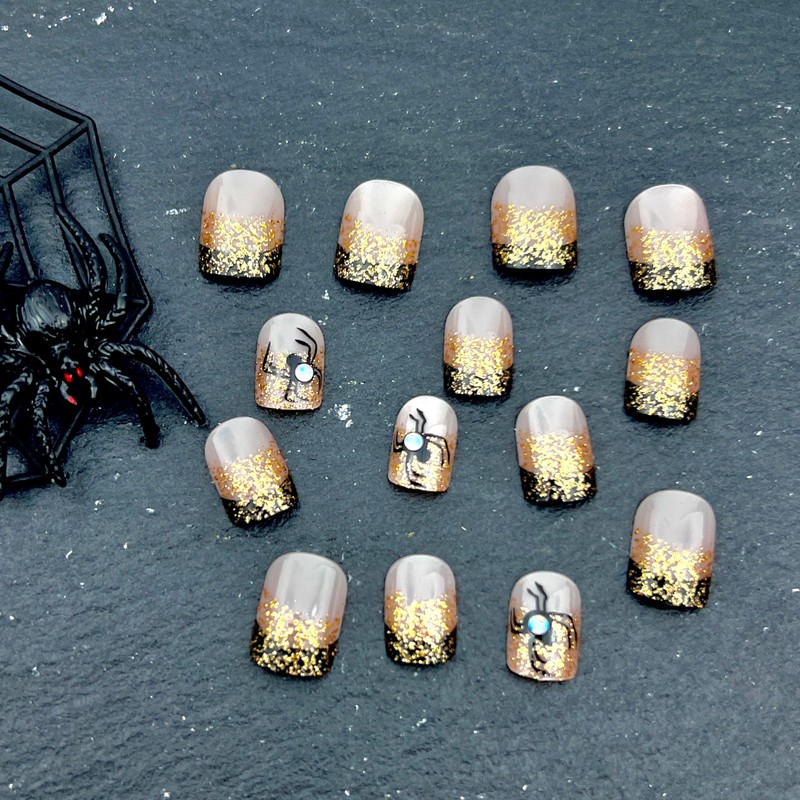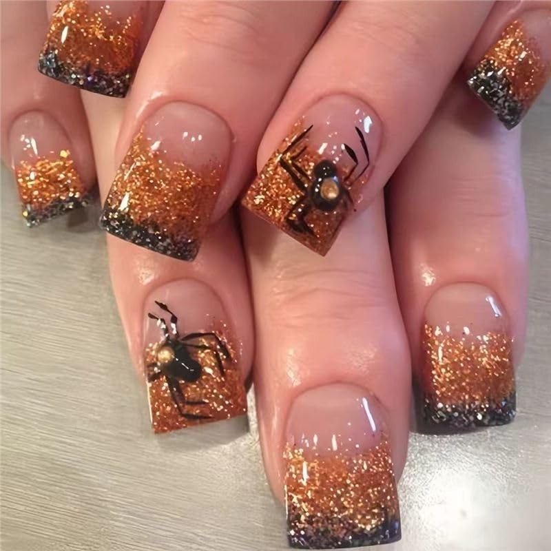 Halloween Orange Glitter French Tip Press-On Nails Short Square False Nails with Embossed Spider Gem Charm Design Women's Nail Art Decorations 24pcs
