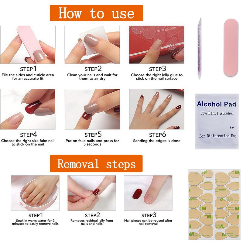 1.Soak your nails in warm water and gently peel off the pre-glued nails from the side after a few minutes.