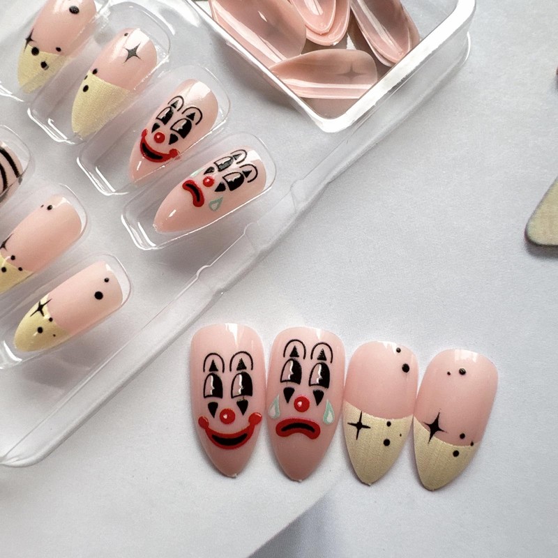 Halloween Press on Nails French Fake Nails Yellow False Nails with Star Swirl Design Clown Face Acrylic Nails Medium Stick on Nails Full Cover Almond Glue on Nails Cute Artificial Nails for Women