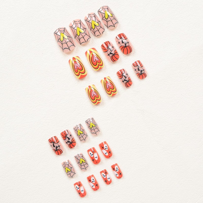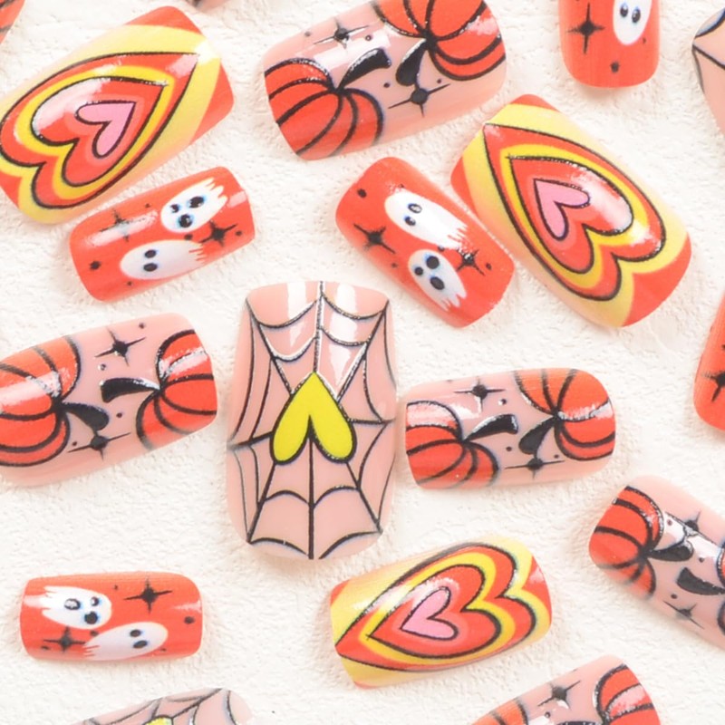 Halloween Press on Nails Medium, Cute Love Pumpkin Ghost Pattern Halloween Series Fake Nails, Glossy Orange Glue on Nails Spider Web Artificial Nails Square Shape Halloween Stick on Nails for Women