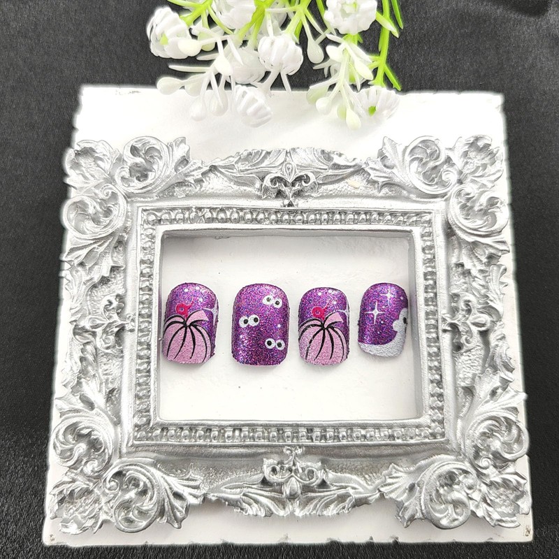 - Package: A box of 24 pieces of halloween press on nails kit 24 pcs of jelly glue 1 small wooden stick 1 nail file and alcohol bag Our set does not include glue(Glitter is easy to fall off please apply protective glue)