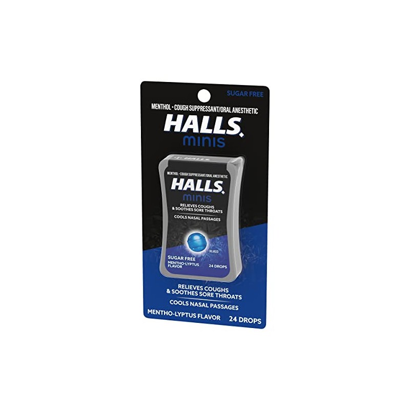 - 1 pack of HALLS Minis Mentho-Lyptus Flavor Sugar Free Cough Drops (24 menthol cough suppressant/oral anesthetic drops total)