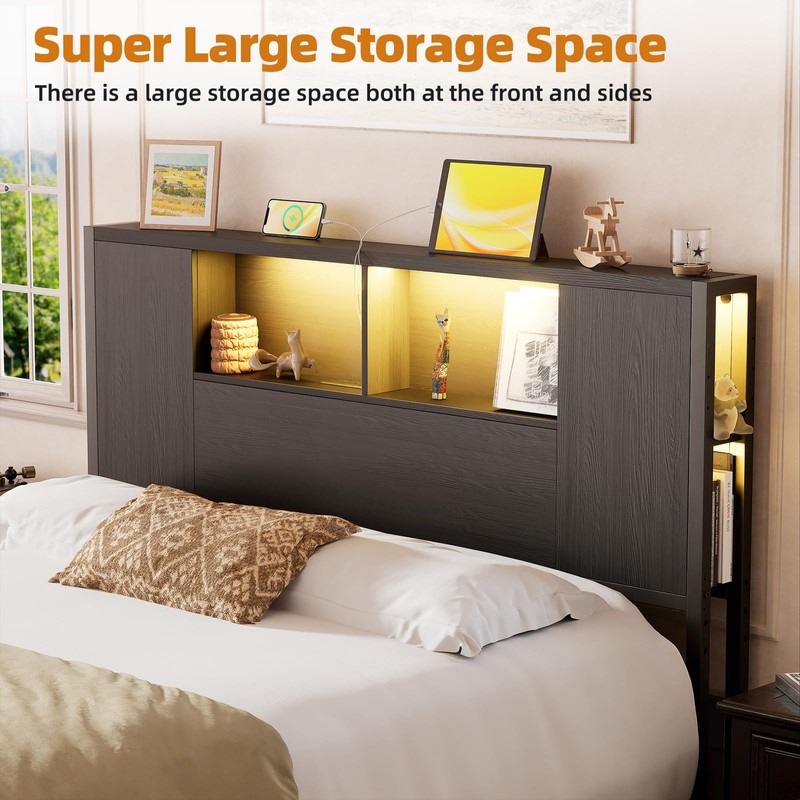 HALLYBEE Headboard for Full Size Bed with Charging Station and LED Light, Height Adjustable Wood Headboard with Large Storage Space and Anti-Slip Foot Pad, Sturdy and Stable, Easy Assembly