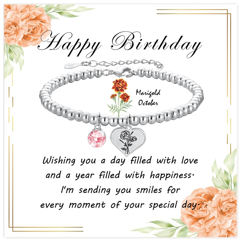 - October Birthstone Flower Bracelet: The October birth flower is marigold, symbolizes passion, creativity, warmth and winning affection. It represents the beauty and resilience of life, even as days shorten. The heart pendant hangs engraved with the 12 birth flowers, matching the silver bracelet's month cubic zirconia birthstones. Subtle sparkle and classic, perfect for celebrating birthday gifts.
