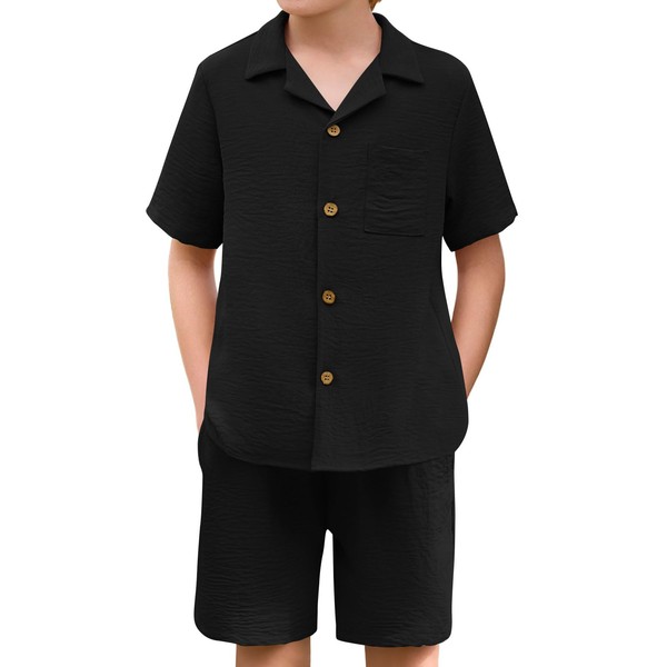 Haloumoning Boys 2 Pieces Summer Outfits Beach Short Sleeve Button Down Shirts and Shorts Vacation Texture Sets for Kids